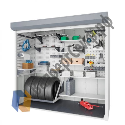 Сборно-разборная, модульная система хранения роллетного шкафа, имеет множество вариантов наполнения, для хранения любых вещей: инструментов, колес и аксессуаров.